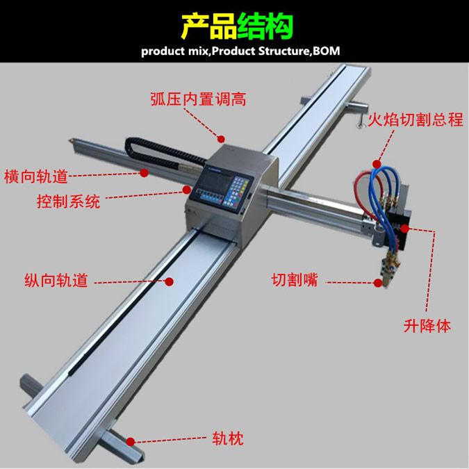 便攜式數控切割機是由數向y軸和橫向x軸兩個橫梁構成、y軸為主梁,上面安有主機和直線導軌、可以讓主機攜帶x軸在y軸上面移動、從而形成切割的長度、在實現生產應用中、y軸一般是以2米--6米之間,當特殊用戶需要加長的時候生產廠家會給其直線軌道做拼接。
